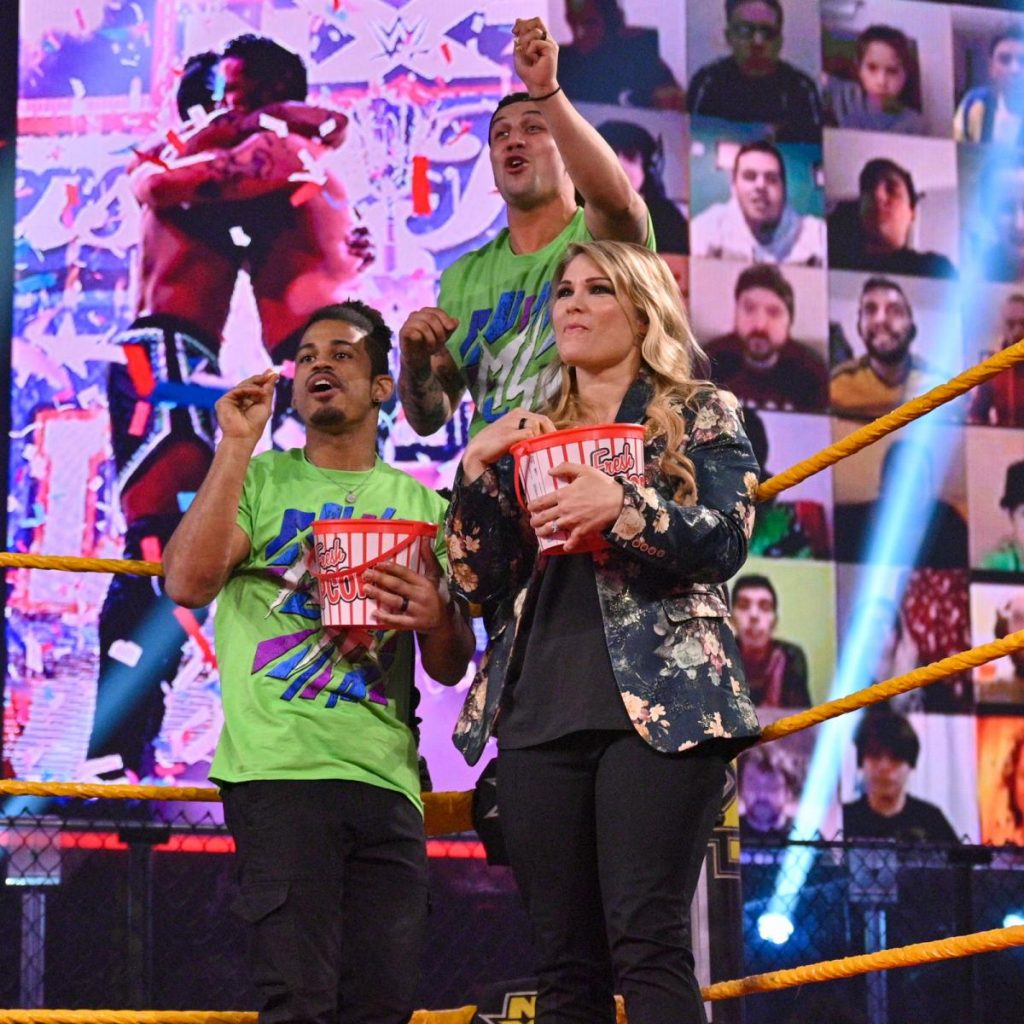 MSK stuck around to celebrate with Dakota Kai and Raquel Gonzalez, they even held the ropes open for them like gentlemen.