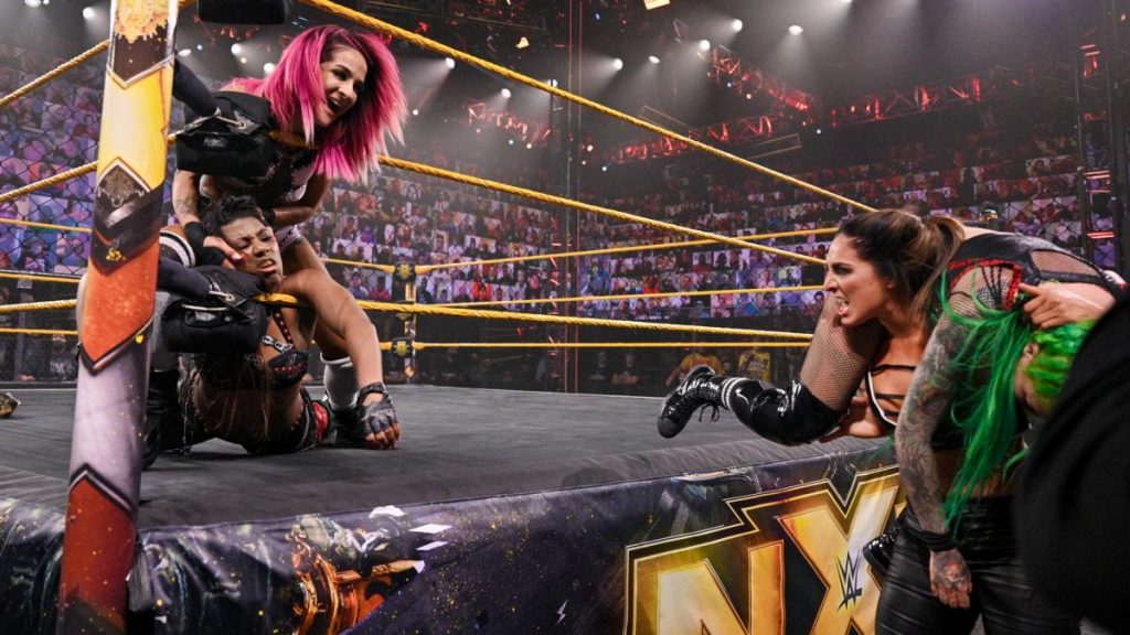 To say Raquel Gonzalez didn’t take it well is an understatement. After attacking Moon and Blackheart, she had Kai hold Ember Moon still while she hoisted Blackheart up and smashed her into the plexiglass then dropped her on the barricade.