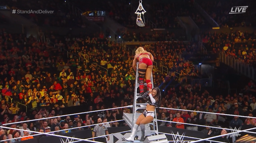 I generally don’t like multi-person matches with a load of spots tacked together. The spots aren’t what annoy me here though. The first ladder is set up in the wrong place. The belt isn’t hung up properly. The climbing is PAINFUL. It’s the slowest climbing since the 1990s. They do a Terry Funk ladder spinning bit, but Pris starts doing it before anyone is in the ring. Then she falls over. My hottest take here is that you shouldn’t let inexperienced people into a match where fucking up can result in serious injury. It’s irresponsible.
