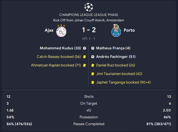 Match day four and we head over to Ajax in the first of two challenging away games. We play excellent football and win quite comfortably in the end, albeit by only one goal. 4 wins out of 4. 1000-1 are we? Let’s see about that.