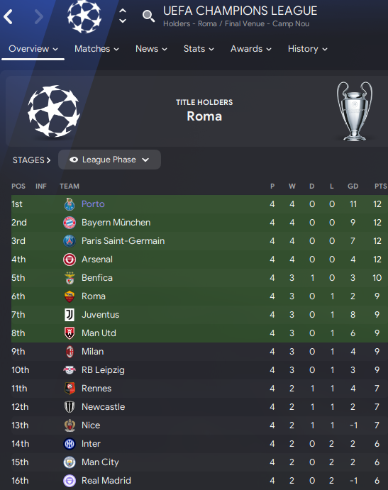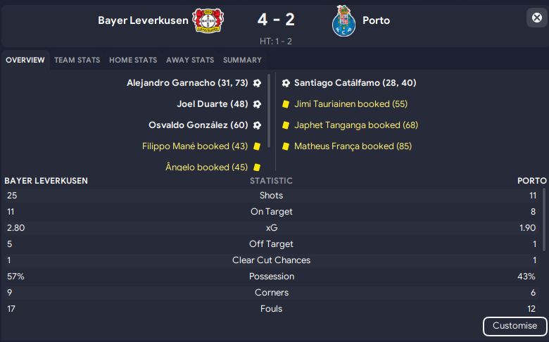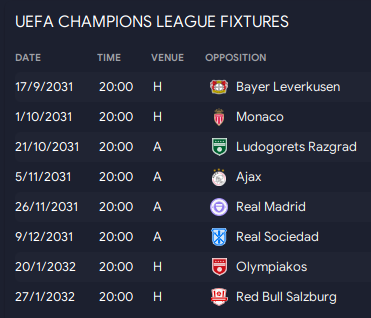 I hate the new Champions League. It’s a move designed on greed alone. Eight games against a variety of teams. Can’t I just get drawn into a group? This is so bad. There are 36 teams involved in the league. You finish top 8, and you go through to the R16. 9-24 play off to make up the numbers. It’s a mixed bag of fixtures. Our next league game is a 7-0 drubbing of Farense. I probably won’t bother mentioning most of the league matches this season because, it’s a cakewalk. Champion’s League next though; versus the champions of Germany, Bayer Leverkusen.