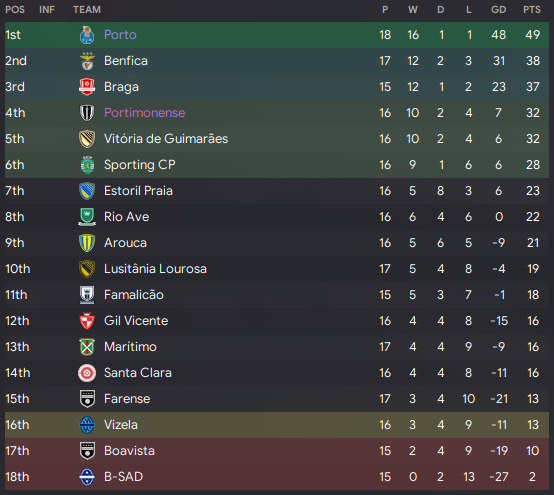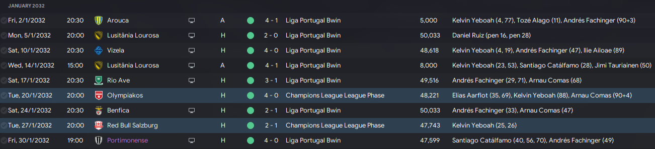 As you can see, our fate is in our own hands. We’re surrounded by some powerhouses of European football. In the Portuguese league, we’re top in late January, and have a home game with Benfica. We win 2-1 with goals from Fachinger and Comas.