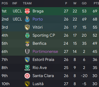 In the league Braga will not go away. We’re struggling to keep pace with them as they win every game. Everyone else has completely fallen off, including Benfica, who I thought would be our biggest threat. We have 19 points on Benfica. Bad news hits for the Man Utd game as both full backs (Furlan and Tauriainen) get injured. Leaving us with Tanganga and Arroyo to start. We were in trouble already, that does not help. After 28 games we’re still neck and neck with Braga on 72 points. 76 points won the fucking league last year. We still play Braga in the league before the season is over. Could be a title decider.