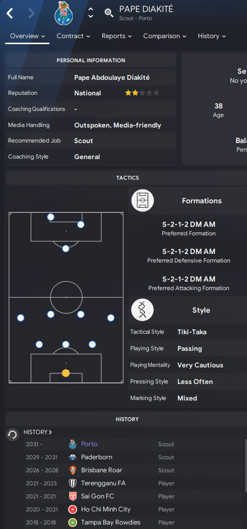 Would it be my team without Papa Diakite? He joins us again in a scouting capacity. He has now spent almost the entire journey by my side. You may notice all his tactical stuff is the exact opposite of mine. We argue a lot over pints. It’s delightful. A lot of pundits get on Porto’s case but they go into the season thrashing Santa Clara 5-1 on an island jaunt to the Azores. Andres Fachinger scores a hattrick. He only scored 2 goals all last season. This guy only has 31 career goals before this season. Then, second game of the season, he scores twice as we beat Roma in the UEFA Super Cup. Yes, we beat the champions of Europe. Admittedly, by scoring twice in the last minute.