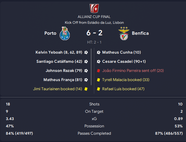 Hahaha. We did a madness here. Sure, Benfica had a player sent off at 1-1 but we all know 10 men are overpowered. If anything it makes my achievement more awesome. This is only Porto’s third Allianz Cup. IRL they’ve never won it!