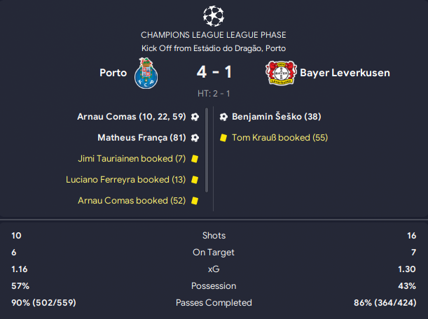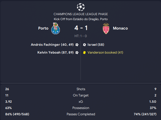 Fuck. It was a close game, but we end up two goals down from the first leg. My boy Santiago Catalfamo popping up with a deuce. We are now at the level where Porto are going to find games hard. It’s also disappointing we led at half time and still lost. My only complaint about the game is that their fourth goal was lucky, a deflected shot landed at Garnacho’s feet, but other than that the result was the correct one. Something that I’ve not really mentioned is that due to rotation Fachinger is getting the same sort of game time as Kelvin Yeboah but Yeboah plays against the shitty teams. So, Yeboah has a career best goals tally of 21 from only 11 starts.