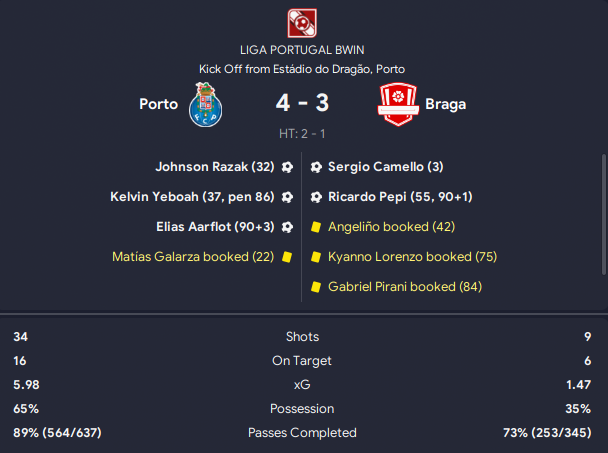 We have a bizarre 3-3 draw with Braga where if we’d won, we would win the league. This is Braga’s positioning on their injury time equalizer. Yes, he is offside. He’s clearly offside. We even get a replay with the lines drawn on the pitch and he’s fucking miles offside. How has VAR allowed that to stand?
