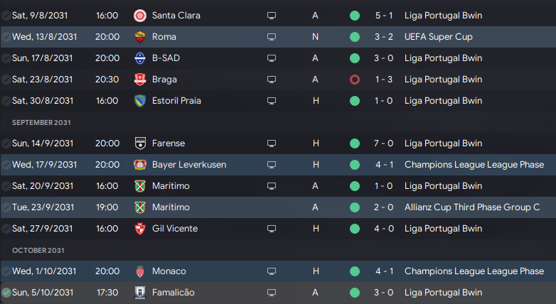 This was my opening day running at this division. Braga aside, we’ve crushed it. Our next cup game is against Varzim, which puts us in an interesting position. This is a team that’s already lost to our B team this season. So, naturally, we lose 4-3 to them in a hilarious encounter. Maybe I should have fielded the B Team.