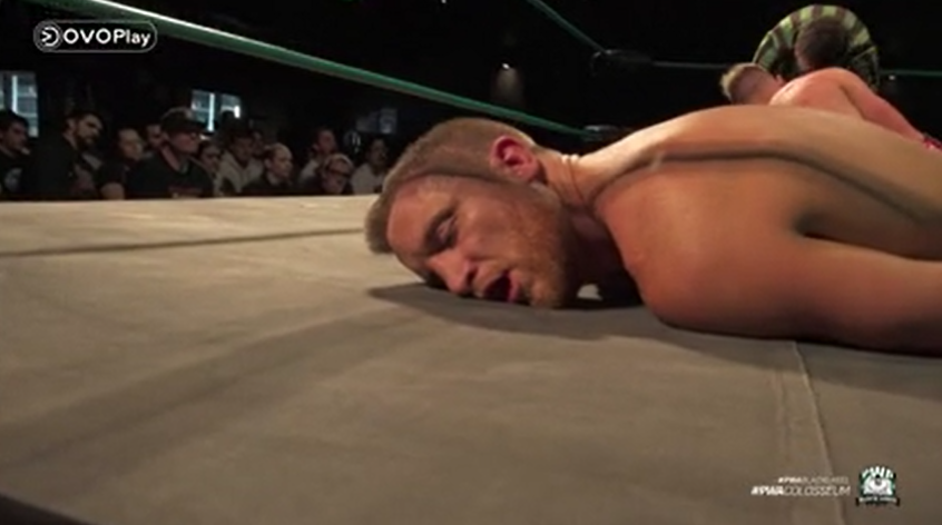 Wahlberg’s idea of fan interaction is to line up fans and dive over them. It’s a lawsuit waiting to happen! Wahlberg is a completely different beast here to the rest of the tournament. Like he’s switched into a different gear. Or rather a switch into different gear changed his mentality. Trav does a bang up job of bringing his A Game but ensuring the star of the match is Wahlberg because this is his tournament. Trav offers a very physical style, which allows the bigger Wahlberg to take a kicking and earn the big win. They perhaps play it a bit safer than Ugg and Bonza earlier and don’t exactly murder each other but it’s still a competitive contest.
