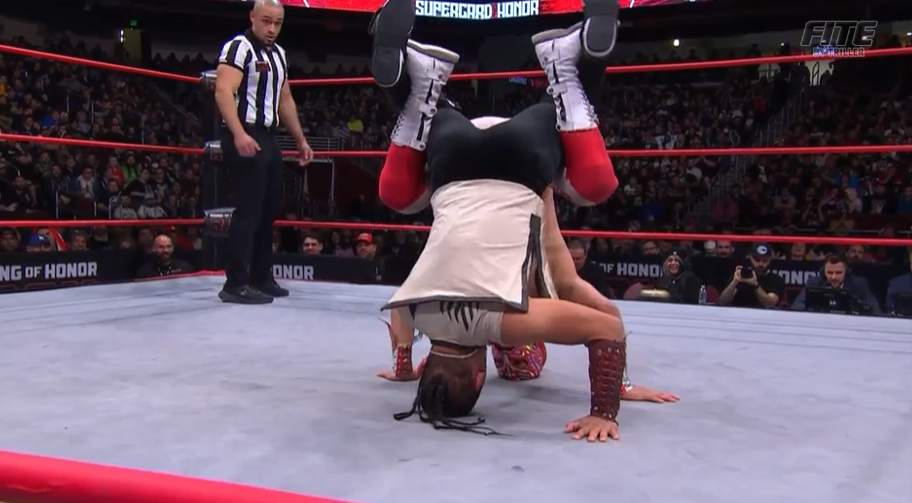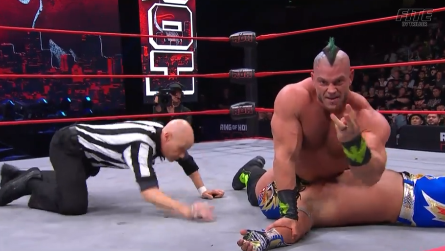 If ROH, as a promotion historically, has a weak point it’s the women’s division. Willow is a fun wrestler but she’s not on the level of most ROH wrestlers. She telegraphs heavily and isn’t very mobile. Even when she’s doing stuff that’s hard, like cartwheels, she looks awkward. I’d rather she stuck to simple stuff where her size can make those moves effective. Maybe throw one wacky spot in every now and again. The simple flaw of this match is it doesn’t look real. Pounce sets up a massive powerbomb and Willow takes it. Both those moves looked awesome, because there was no counter and she could go all in. Willow, and Alize, need to learn how to make moves that aren’t connecting look like they should.