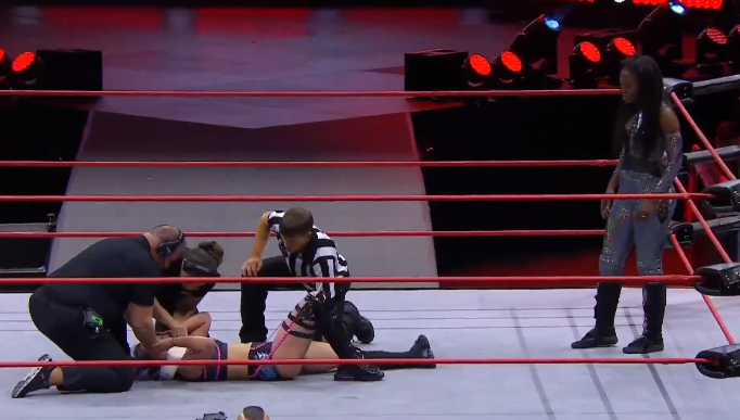 Now, I’m not presenting a review of this match because they do a god awful, should be illegal, injury angle. Starkz going down holding her neck. Commentary do the Owen Hart voices. Everyone in the building thinks they’ve seen a real injury. I’ve seen footballers have cardiac incidents and the whole ground goes deathly quiet. No one wants to see this happen. No one wants a replication of this in the sportz entertainment world but ESPECIALLY if it just serves as a bullshit fake injury angle. This sucked. Whoever thought it was a good idea should legitimately be fired and never work in wrestling again. DUD