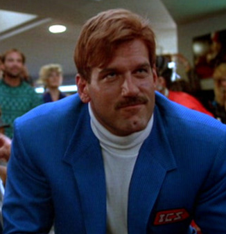 Ventura welcomes us wearing an obvious toupee. It looks like the one he wore in the Running Man. Seeing as he was in the Running Man in 1987, I assume he was filming it at the time. Did he have hair in Predator? If he did it was hidden by a bandana.