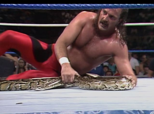 A heel-heel matchup, which is the company trying to figure out if the crowd would like Savage as a babyface. However, LA has other ideas and the crowd chant “DDT” loudly immediately. Even when Jake is waving that snake at Elizabeth. Hey, he was cool! Savage was a chicken as a heel. He used to hide behind Liz. Jake isn’t hiding behind Damien, it’s an extension of him. They had to turn him face. Vince thinks the crowd prefer Savage, as they continue to loudly pop everything Jake does. That Vince, eh, what a fucking genius? For modern fans, it’s nice to see how out of touch Vince has always been, even when he was at his creative pinnacle as a booker. Both these guys are great characters. The wrestling is almost secondary.