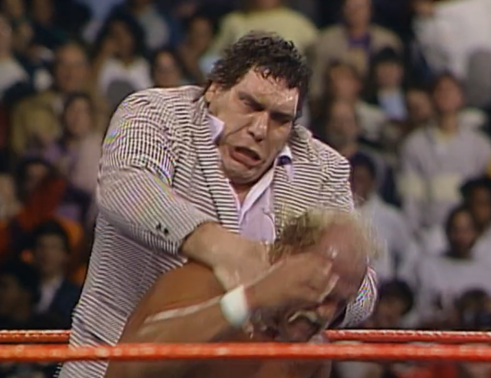 Andre was kicked out from ringside last time, so Heenan has given Andre his manager’s licence for this as Heenan has a bad neck. Again, from the last match when Hogan attacked him.
