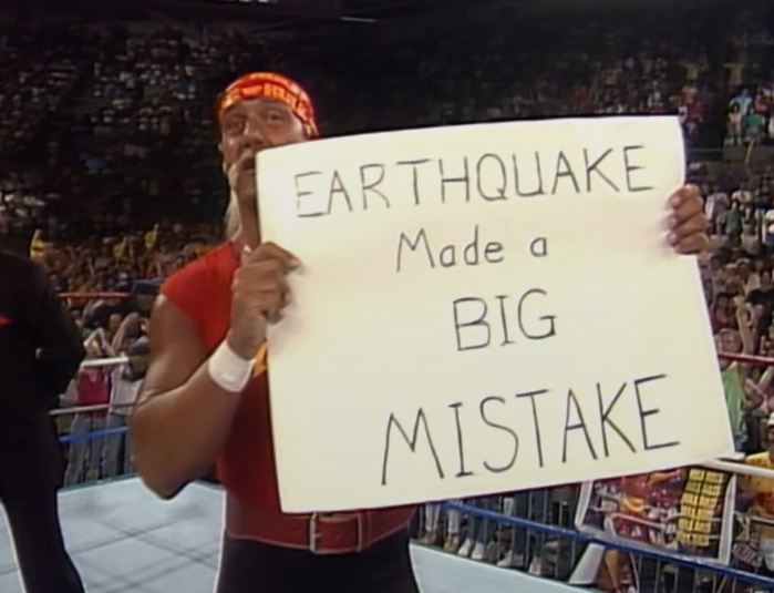 So, the theme of this show is “Animal Kingdom”, which leads to a series of skits involving Gene Okerlund and Alfred Hayes mimicking a TV show I’m not familiar with. I won’t go into details, but Hayes takes it seriously and Okerlund does not. We also get a ‘tribute to Hulkamania’ as Hogan is on his way back from being squashed by Earthquake. It was an excuse to write him off TV while he was making a bad movie. Sad “Real American” is the saddest of all theme songs.