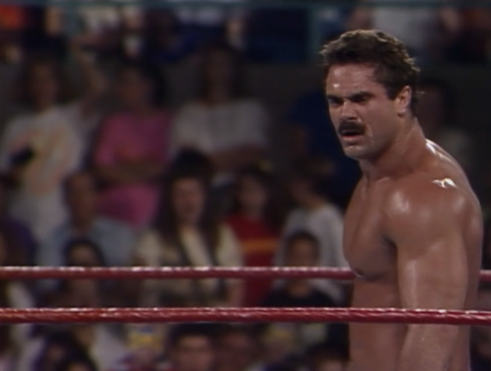 Rude is the number one contender because he beat Warrior for the IC belt. Rude is the only guy who’s beaten him, ergo, he gets the shot. They used the same logic in the Great White Hype. Rick is a good choice to sell all Warrior’s stuff. He does a lot of overblown selling, so Warrior just has to connect and let Rude do the work. It’s a good performance from Rude and it was enough to win him the title match at Summerslam.