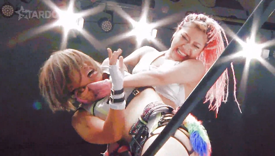 I don’t remember Arisa wearing a mask before. It’d be odd if she ended a tour debuting a new look. Kagetsu goes after the leg in order to eliminate all the kicky kicky business. When that isn’t effective she tries to annoy her. They spend a little too long grinding away at holds. For example Arisa has a chinlock on for ages and Kagetsu gets a lot of leglocks. The latter at least makes sense and the crowd bite on it. However instead of going somewhere they just have them go from that to kick duels. I’d rather they just skipped all the rest holds and kicked each other into a double KO in five minutes but that’s me. Instead they do a double KO spot and the time limit expires. This didn’t have enough ideas for 15 minutes, which is quite disappointing considering the participants.