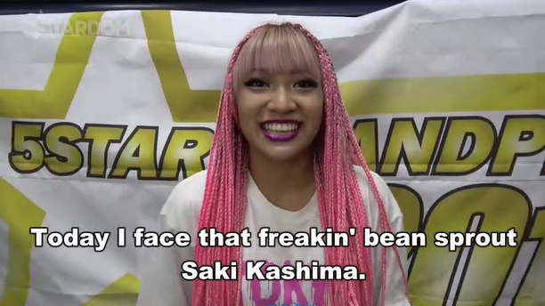 Hana is in full dickhead mode and she jumps Saki before she’s in the ring but gets caught in a roll up and loses her perfect record! Saki gleefully goes to the timekeeper and gloats about it lasting 8 seconds. This gets her a second beating, which she thoroughly deserves. Bean sprout with the upset.