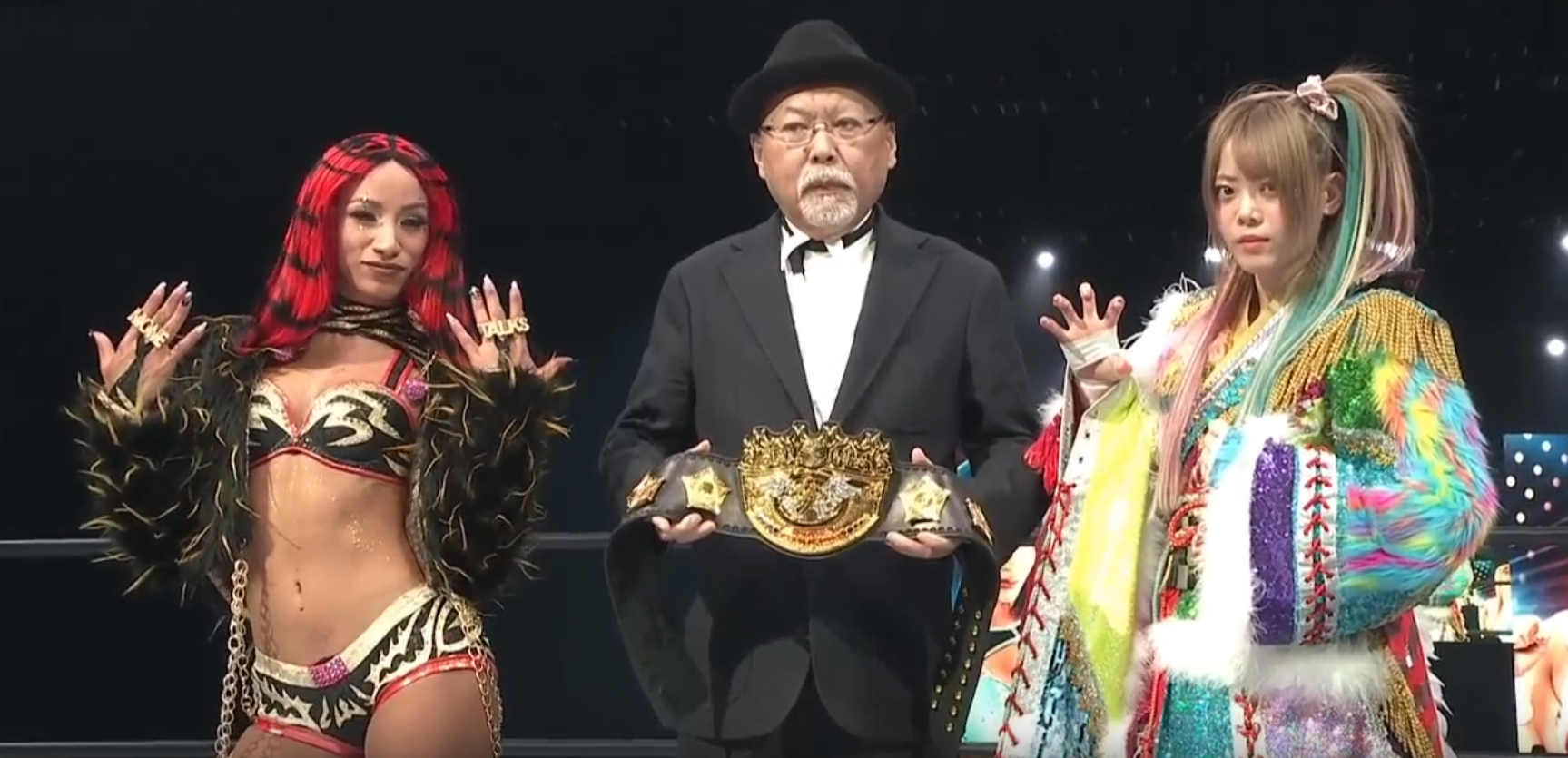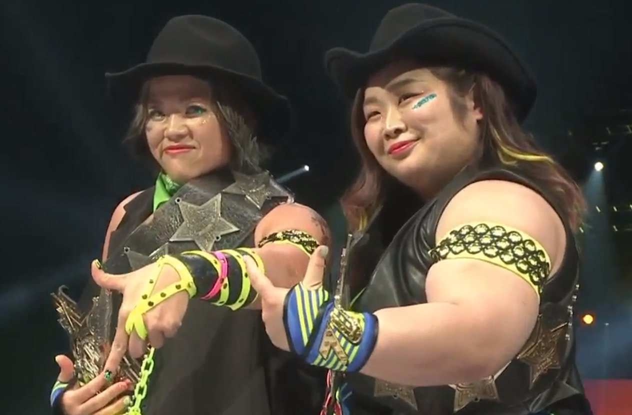 She wasn’t dressed as a cowgirl. I still think about that Yuu run in England, where she lived there for six months, and wonder why no promotion stuck a belt on her. EVE eventually did, to be fair. The story they tell here is pitting the veteran champions against two plucky young upstarts. It doesn’t do much for me. Especially as one of the big spots is a double running T-gimmick on MIRAI and she turns it into an armbar on Yuu during the pin. It gets really sloppy out on the floor and the champions lose on count out, which means the belts change hands. Boo-urns.