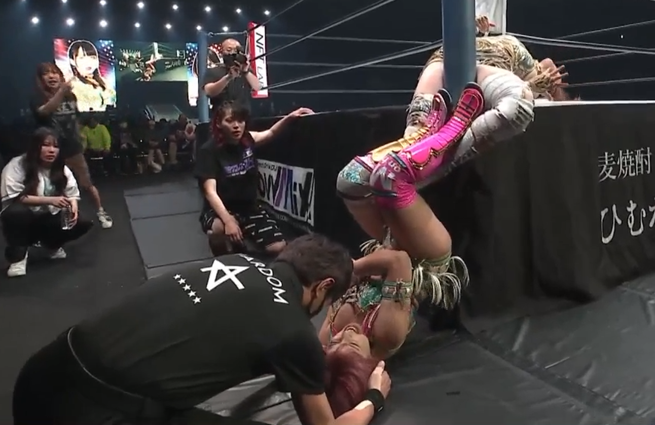 Mina goes after Kamitani’s leg and we get a ring post Figure Four! Someone has been watching their Bret Hart tapes (or possibly Dragon Aisu in 3CW, one or the other). My concern about doing a leg match is the selling aspect. Will they be consistent with it. Will the match make sense. A lot of this is on the planning but also on Kamitani and whether she can execute her part. Some of it works. She does a slingshot so she can hold the ropes on a dive spot instead of using her legs. She collapses on an Irish whip. But it’s not long before it’s all forgotten and she’s bridging on the bad leg. She does have an issue on the ropes where the knee is bad so she can’t do the Phoenix Splash. She can’t push off. I like that. Shirakawa doesn’t help because she switches focus in mid-match and just starts popping off high spots, like she ran out of ideas on the leg and it’s left to Kamitani to injure her own leg hitting spots.