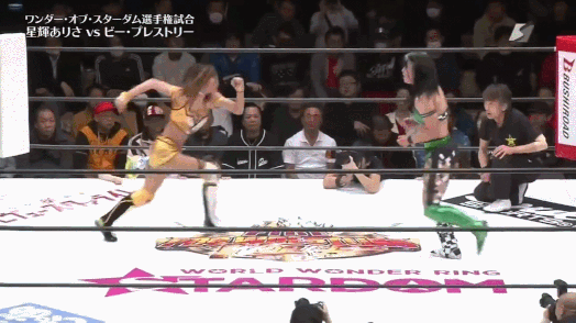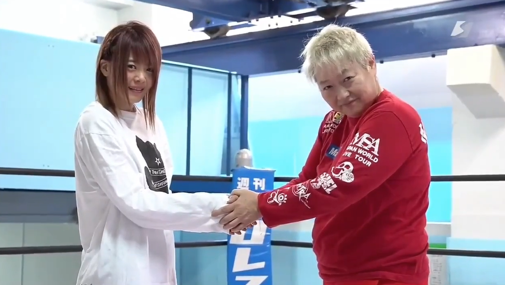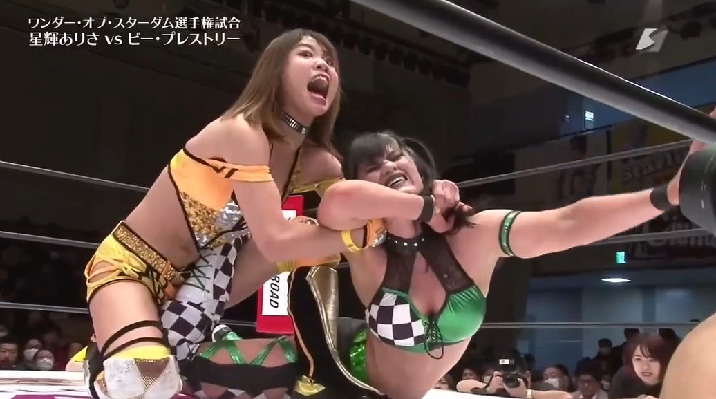 Bea has been working on an interesting (read: dorky) new look. She’s off to the malt shop afterwards to put her pocket money in the jukebox. She’s really sloppy here and accidentally puts both her clumsy feet in Arisa’s jaw in the early going.