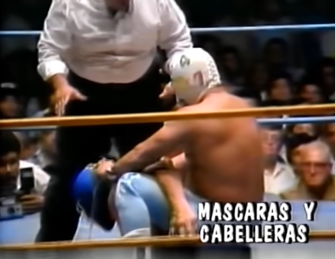 EHDS is a bit of a jerk about it, and he runs All Star face first into the ring post and goes right back to the camel clutch. The crowd let him have it. “YOUR DAD WAS BETTER!” “YOUR MASK IS TOO SHINY” “THOSE TIGHTS MAKE YOU LOOK STUPID!” He then sandbags All Star, and the result is an ugly half powerbomb that is fantastic. All Star is bleeding through his mask, but it hasn’t dulled his appetite for doing stupid dives. He cannot stop throwing himself over/through the ropes onto concrete. He lands harshly and lies there bleeding, and the referee counts him out. The crowd are HOT about it, and it looks as if a riot is about to break out. I was under the impression El Hijo del Santo was a babyface here, but they fucking loathe him. As for the match; it’s entirely pointless until the latter stages but boy, does it get HEATED when it does get going.
