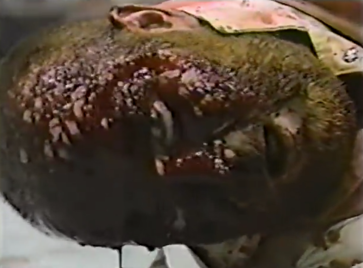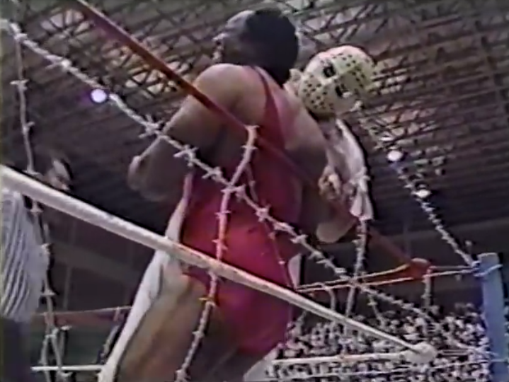 As you can see the barbed wire is more plentiful here than in FMW’s barbed wire matches. Puerto Rico was more about blood than Onita. The hockey mask works to Jason’s favour here because his face is protected. Jason sells like Jason. If you’ve seen the movies, you’ll know what I mean. The gimmick should be more protected though and Jason shouldn’t be leaving his feet, doing silly little stomps or arguing with the referee. It’s a prime demonstration of not investing 100% into the gimmick like Kane did.