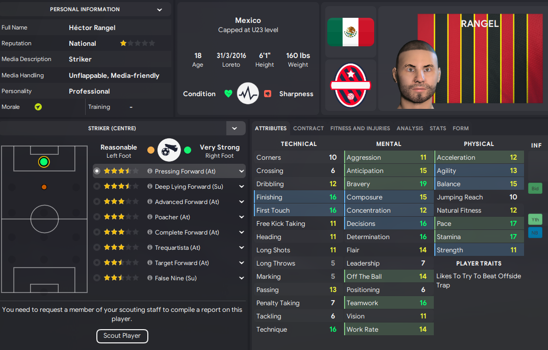 My first piece of transfer business is recruiting another forward, as we’re a bit short, and this guy is the first player my scouts recommended. Hector Rangel. 18 years old, a natural pressing forward, big potential. He’s already great.