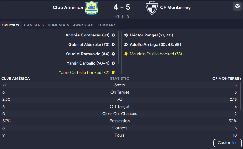Puebla roll over and play dead at home. Hector Rangel has a hatty in 21 minutes. We run out 8-3 on aggregate winners. Puebla’s second half comeback allowed me to test out a sunken midfield, which worked quite effectively in creating a barrier to stop lesser teams coming at me late on. While not impeding on our attacking prowess as Bejarano crossed for Arriaga to score with us in full on defensive shield formation. TO THE FINAL! Club America, arguably the best of the rest in Mexico, await us.