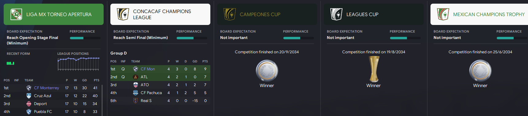 This is Monterrey. It looks pretty cool. I like that they built the city around what appears to be a hill that is still covered in forest. Monterrey is in the North-East of Mexico. It’s really warm and it never rains, apart from in September. It’s the second largest city in Mexico and has a population of around 5M. They eat baby goats or “cabrito”. The city hosted matches at the 1986 World Cup and will do so again in 2026. The city has two teams in Liga MX; CF Monterrey and Tigres UANL. Monterrey have five league titles, Tigres have seven. Monterrey has won more CONCACAF Champion’s League titles than any other team with five. In my save they’ve added another one and are regular contenders. Which is why I’m here. We might be able to knock CONCACAF off in one season.