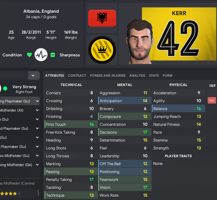 Transfers are weird because I’ve never seen any of the players play. I can see there are issues though. The two central midfielders suck and hate playing together. The keeper is bad. The left back is bad. The keeper situation is quickly fixed as I bring in Mamelodi Sundowns stopper Rowan Radebe. He can’t sweeper keep but he’ll do for now. We next add a playmaker in Ryan Kerr, who’s Albanian if you can believe that, and started out at Weston-Super-Mare. Due to scouting issues, I don’t know exactly how good he is but when he arrives…holy shit. First touch 16, decisions 17, vision 17, PENS 17. How have I got him?