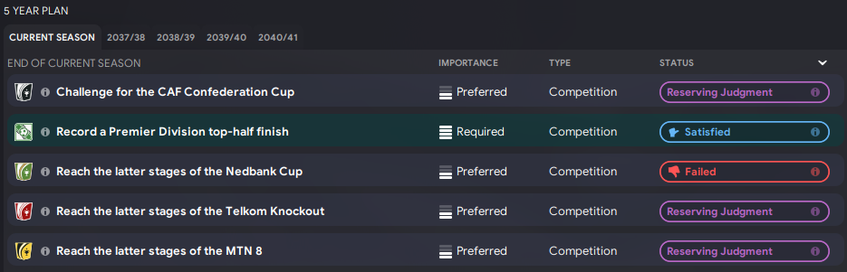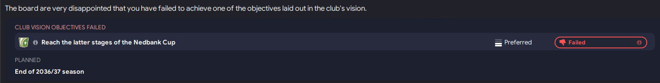 The league race is wide open. 10 points separate the top ten teams. The lead chops and changes. Orlando Pirates used their win over us to catapult themselves into the title race. My ploy to sneak into the Champions League by winning the Nedbank Cup comes undone when we draw Stellenbosch away from home and lose 3-1. The board give me a big old red FAILED for that too. We were supposed to make the quarters.