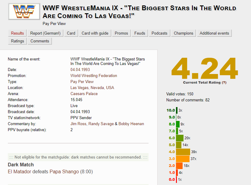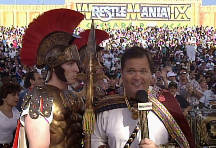 But I am a man of my word and if Nic wants me to review this piece of shit then I’m reviewing the fucking thing. WrestleMania 9 is a pretty interesting show to be honest. It had a great set, at Caesar’s Palace, and one of the smallest Mania crowds ever (16,891/15k depending on who you believe). It also featured Jim Ross in a toga, which he was most indignant about. Probably should have researched his boss before signing up to the WWF. This is the carny bullshit they run mate.
