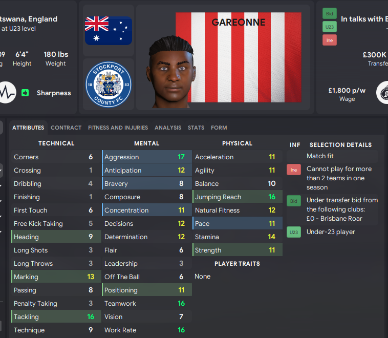 Also joining us in the summer will be Gofaone Gareonne! He is Australian, has incredible jumping reach and he’s 6’4”. He’ll score from corners, I guarantee it. He’s a grafter. I want to pair him with Stephen Shearer or Stachowiak at centre back. Having four good central defenders is good news. Have I mentioned how stupid the A League rules are? You literally cannot buy players from other A League sides. So, if I want to sell a player to another team, I have to trade for one of their players or just loan him out until his contract expires and I get nothing. Loan fees are also against the rules. Fuck is this?