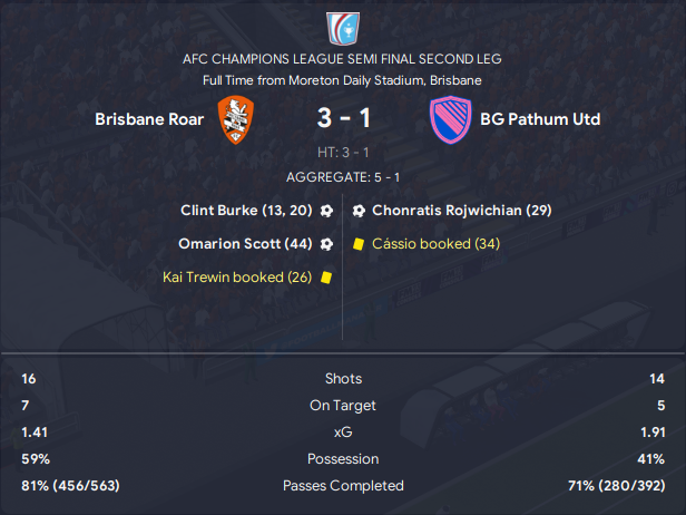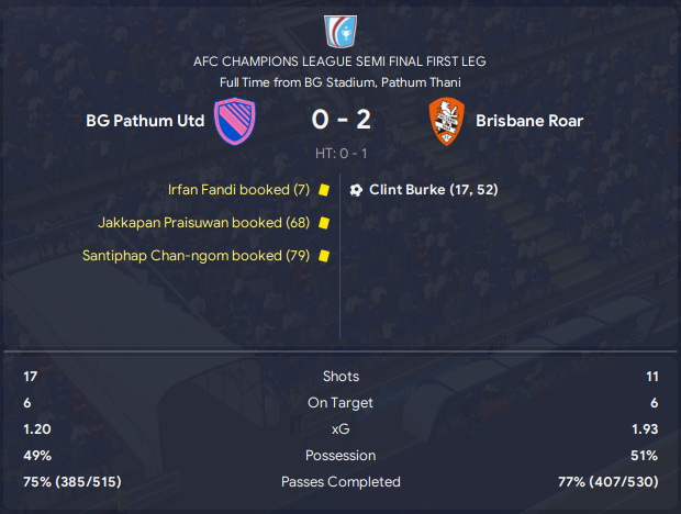 What a start to the semi-finals! Clint Burke’s assured finishing takes us to a 2-0 away win in Thailand. We were, just about, the better team. The Asian Champion’s League final looms!