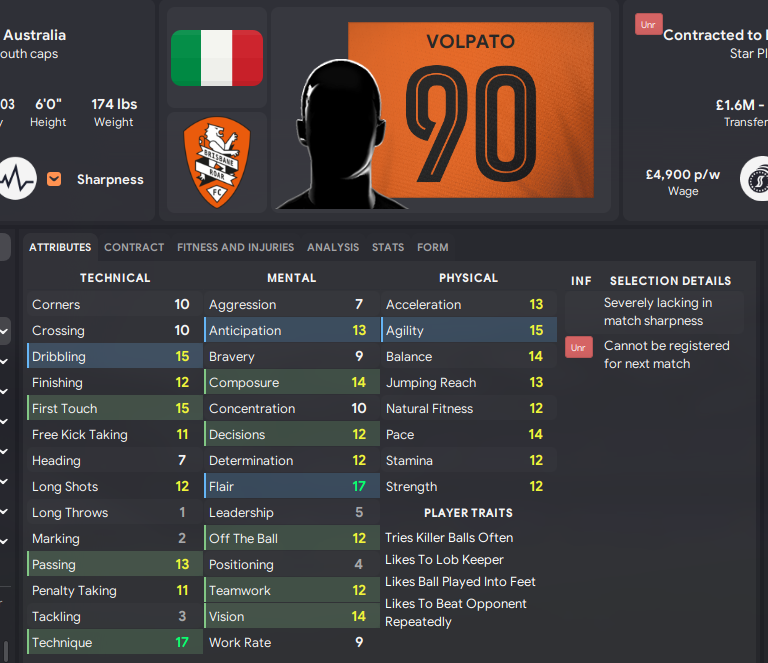 Just as I’m thinking January sales are a bust Roma release Christian Volpato on a free. He’s Australian! He fucking rules! I jump on him and sign him up. It’s a big, big contract but he’s an elite player. Great physicals, loads of flair, good tekkers. Left sided central midfielder, who should work well with Dennis Adrenaline.