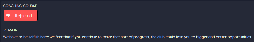 How do I get around this? Every time I request a coaching course I get told this. You can’t do a coaching course because you’ll leave. Well, duh. I talk it through with the board and promise to ensure no coaches are over worked and areas understaffed. It’s pretty easy. I was doing all the goalkeeper training for some reason.