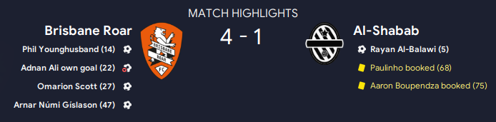 You may notice I’ve had to screenshot the match highlights version of the score because I was bouncing off the walls after this game and forgot to screenshot it in game. The Gislason goal was also an own goal. His cross was turned in at the near post. Al-Shabab are good but they’re not better than us. We’re basically on a par with better forwards. Both defences are bad, which helped us here but could hinder us in the away game. Fingers crossed, we’re nearly there!
