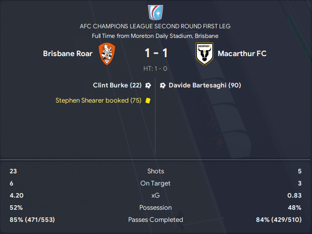 Back into Champions League action and what the fuck is this shit? All over Macarthur for the entire game. Absolutely battered them. Clear cut chances galore. Multiple one on ones. We were brilliant. 1-1. Macarthur had one attacking highlight, which was a long range shot that went straight through our keeper in stoppage time. There’s a reason people hate this game. This is easily the best we’ve ever played btw. We must have had 20 attacking highlights. If we’d have won 5-0, I’d have been all “well, we deserved that”.