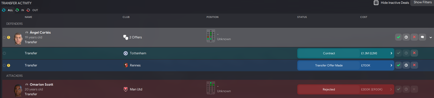 Meanwhile Man Utd make a lazy offer of £300k, with no sell on fee, rising to £900k. It’s a pathetic offer and I have to reject it. I tell Omarion they only offered £300k and he’s all “YOU FUCKIN WOT M8?” He’s as mad as me about it and we agree on a suitable fee of £3.3M, which I still think is low but hey, at least we get some cash. Rennes come in for Cortes and we agree on £2M up front, plus 50% of the next transfer. They’re also willing to lend us Cortes for a season to ensure he continues to improve. The Scott saga is ended by the stupidity of my board who accept £2.6M on my behalf. I COULD HAVE GOTTEN MORE YOU FUCKS!