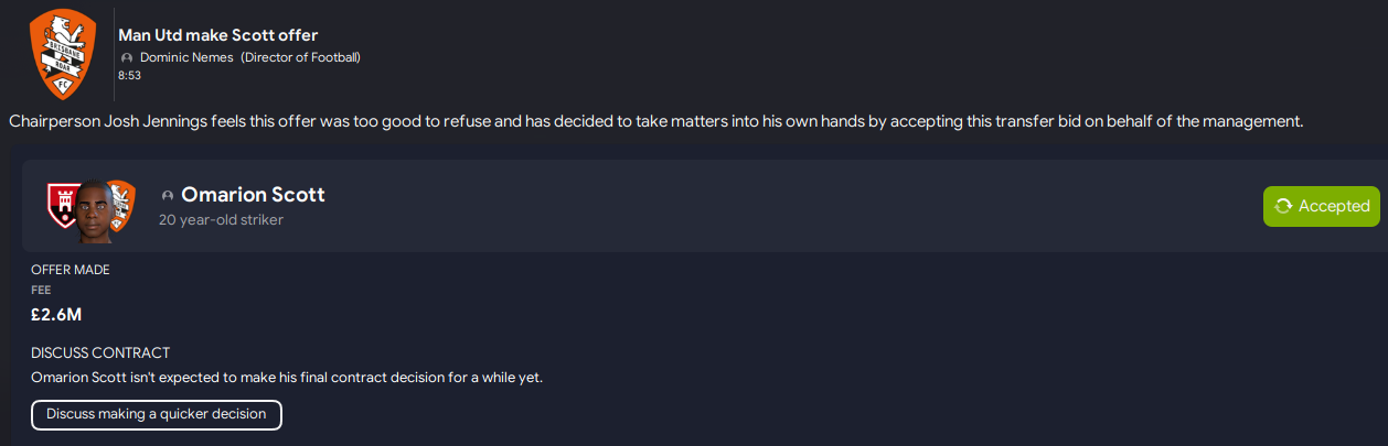 As with Cortes, I’m offered Scott back on loan though and I protest how cheaply he’s been let go. The board renegotiate for £3M. Well, that’s slightly better. The absolute dipshits take everything up front though, so we lose a player worth £50M+ for £3M and no add ons. As with Cortes, I wanted 50% of the sell on. Because he won’t get in the team at Utd and they’ll sell him for millions more than they paid for him. It will be frustrating watching Cortes and Scott develop into world class players…for someone else. Anyway, due to loan backs, “all change” has effectively become ‘no change’.