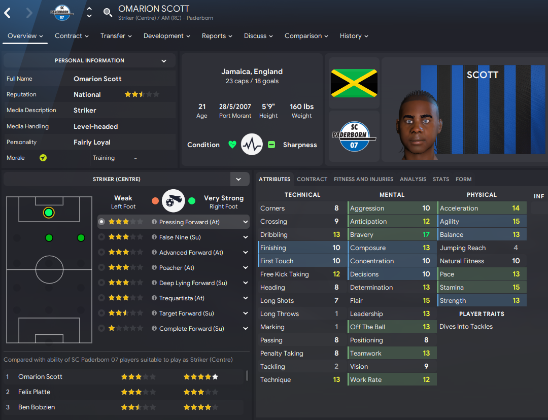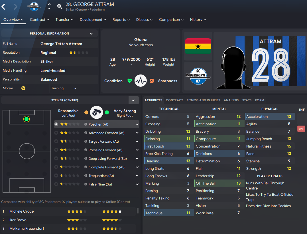 I can’t even register the man. As a Ghanian he’s a non-EU player and all my slots are already used up. I’m sure he’ll bang in a load of goals for Paderborn II though*
