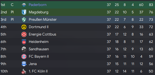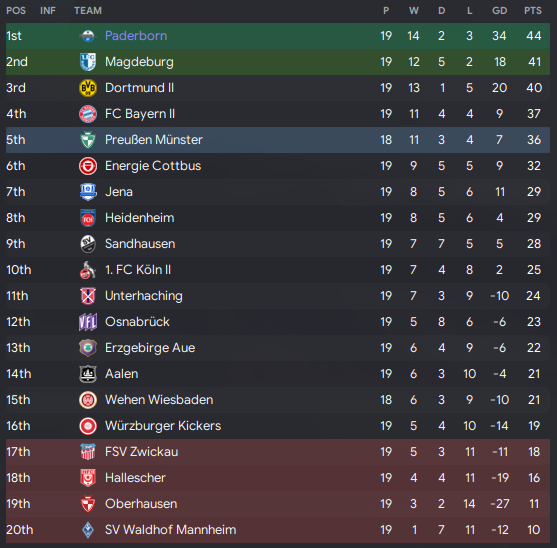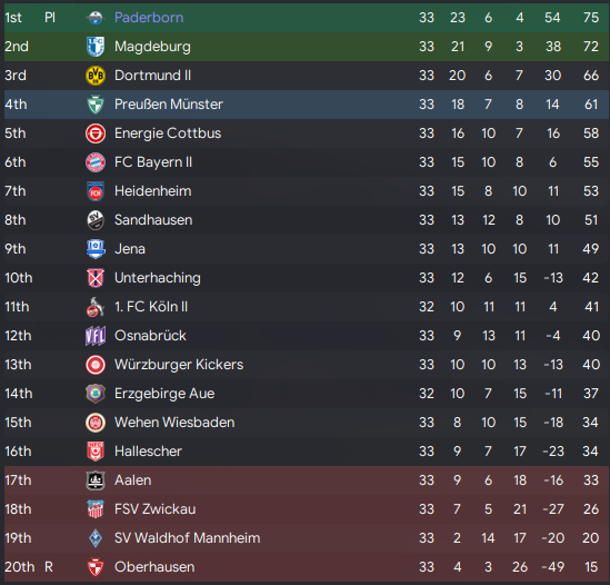 Sad to report Oberhausen have been relegated. With five to go, we’ve secured a play-off spot. Having beaten Munster 7-0 opening day, it’s a shock to see them in that play-off spot. Magdeburg has hit poor form at the perfect time for us. If we win our next game, we are promoted.