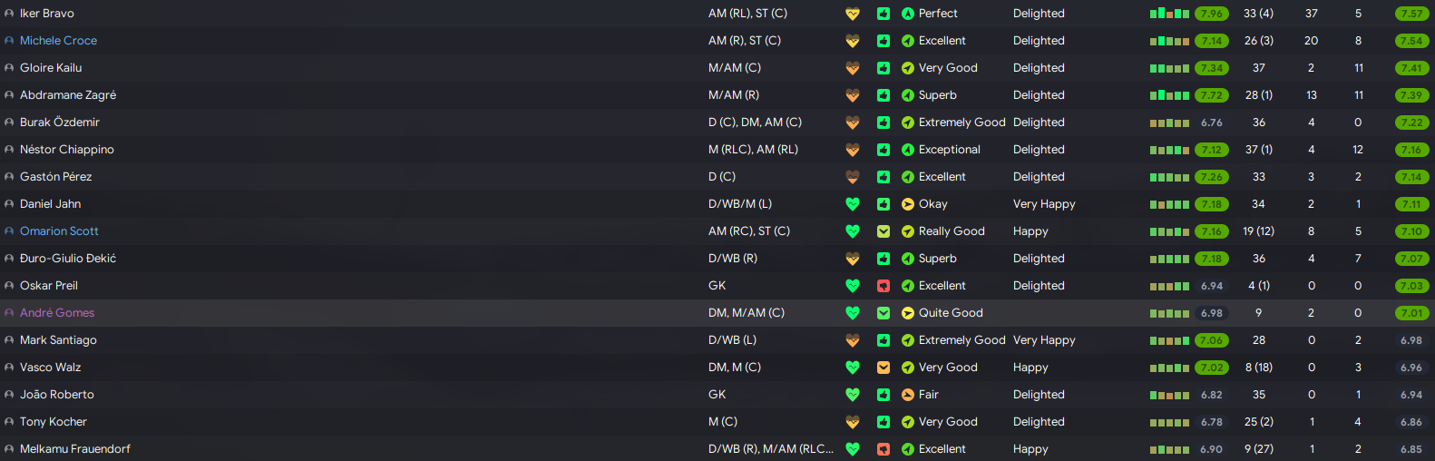 Here’s how they all fared, if you were interested. Iker Bravo scored an astonishing 37 goals. Considering he wasn’t a starter and only some guy I signed on a free with a last minute decision, he’s had a cracker there. Croce, on loan from Napoli, scored 20. Zagre, I overpaid for, but he’s contributed to 24 goals. The good players were all good. I have some painstaking decisions to make before next season. Interesting to note Frauendorf, the only survivor to regularly play, was our worst player.
