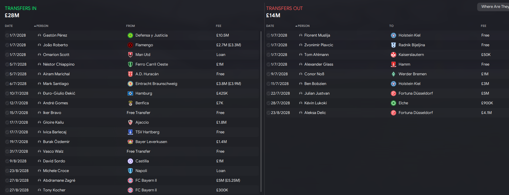 So, just how busy was my first transfer window at Paderborn? Just about the busiest transfer window of all time. I signed 17 players. Some for the future. Some for now. Some a combination of both. Perez has potential GOAT centre back written all over him. Yes, I’ve overpaid. I don’t care. Chiappino is going to be great if he lives up to the potential. The likes of Santiago, Bravo, Ozdemir and Dekic are good now. Zagre might be the biggest steal of the window though. Taken from Bayern for £5M. He’s now my starting right winger. Delic isn’t even a starter for Fortuna, why buy him? Wankers. Anyway, by the end of the transfer window, only Simic starts who was here before my arrival and that’s only because Gaston Perez is injured. Otherwise, it would be an entirely new starting XI. I have gutted this squad.