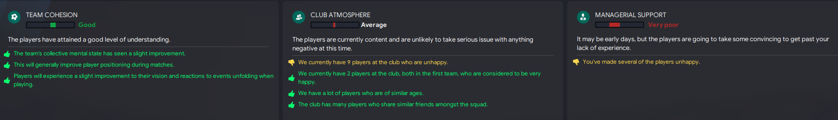 There are a lot of unhappy players, mainly because we’re in 3. Liga and none of them want to be here. I mean, I could just get rid of everybody, as they did just get relegated so they probably stink. I nailed the introduction meeting and the atmosphere shot up after this. Managerial support is still “poor” but hey, we haven’t played a game yet.