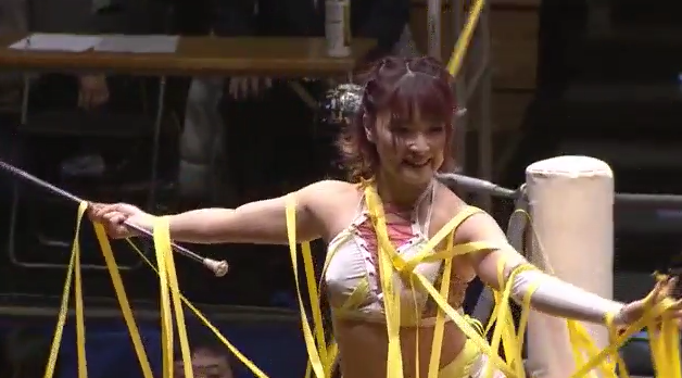 She comes in all business here and while Yuka’s fun-loving persona is in evidence during her entrance she quickly switches to her game face.