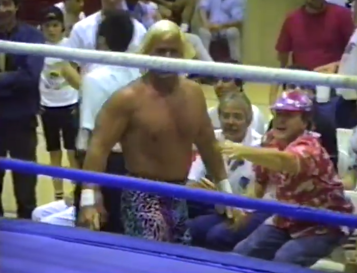 HAT GUY SIGHTING! He’s ringside again here, getting into it with Lawler. He has a baseball cap on, which is just weird. Still has a loud shirt and loud mouth though. The entire match revolves around promos and Lawler’s hidden chain. It is egregiously boring. Lawler does have a mastery over his facial expressions. Nobody does the shit eating grin that screams “I’m so fucking happy with how I just cheated” better than Lawler. Nor the immediate change of gears when a fan yells at him afterwards.