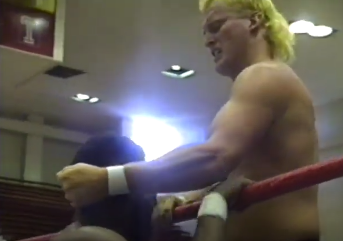 This is “Mondo Kleen” if you’re having trouble visualising him. He certainly looks like a ‘wrestler’. The crack production crew miss Tony Stetson getting pinned out on the floor somewhere and it’s now 3 on 1 with poor Larry Winters left all alone. Given that we’re in a heel city, it would make sense for the heels to just kick his ass and win. Anyway, DC Drake miscues with a chair shot and Mondo is gone. Oh, wait, he kicked out? What the actual fuck is that?