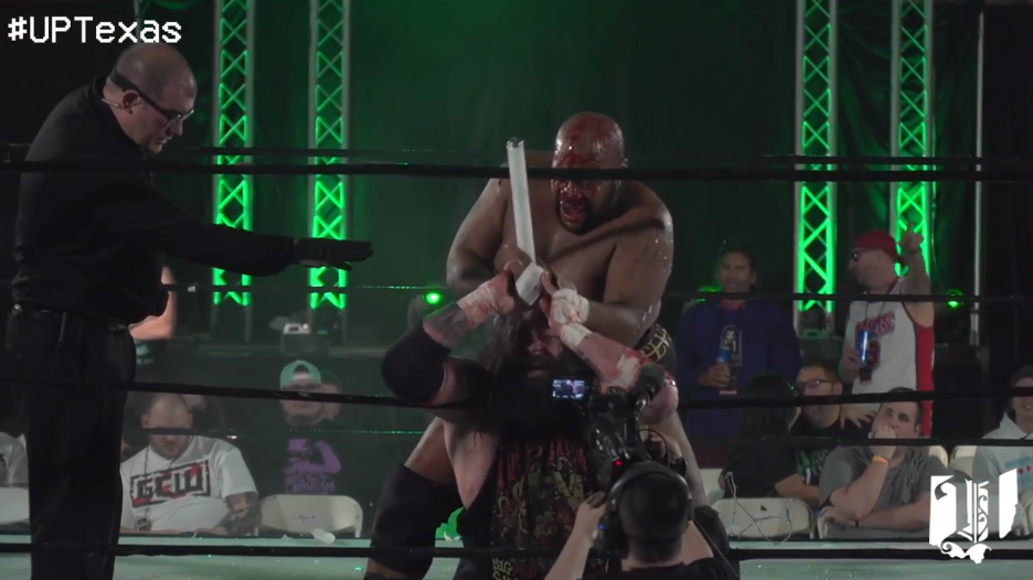 I’ve seen Casanova Valentine a few times and usually he’s in no-ring matches. He’s a bar fight kinda guy. Hoodfoot and Valentine spend the match hitting each other with plunder. There’s a lot of blood. Casanova tears the groin out of his wrestling trousers.